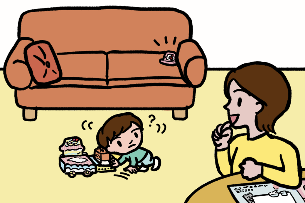 お部屋の中のおもちゃ箱の近く、絵本のそば、ソファの陰、テーブルの上などにケーキを隠します。