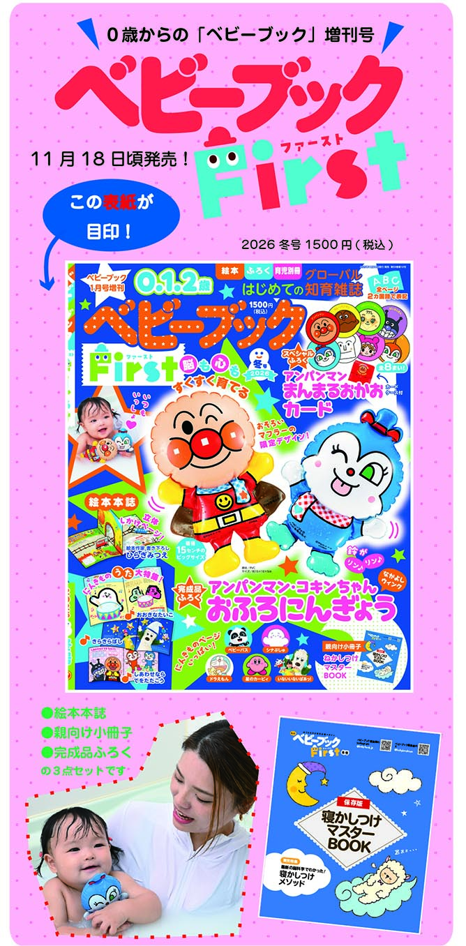 1・2・3歳児向け知育絵本「ベビーブック」から誕生した、0・1・2歳児向けの増刊「ベビーブック First」。0歳から楽しめる赤ちゃん専用雑誌で、どんな本を与えたらいいかわからないというおうちの方に代わって、赤ちゃんが喜ぶコンテンツを厳選しました。「遊び」「しつけ」「知育」を1冊にギュッとまとめ、初めての雑誌体験を提供します。