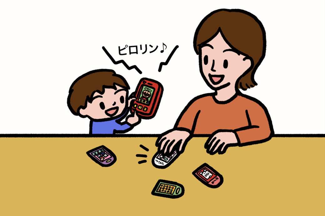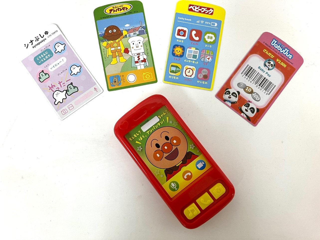 カードを並べて、「これはなんのカードかな?一緒にスマホにセットしてみよう。入れられるかな?」と話しかけながら、カードの出し入れにチャレンジしてみましょう。