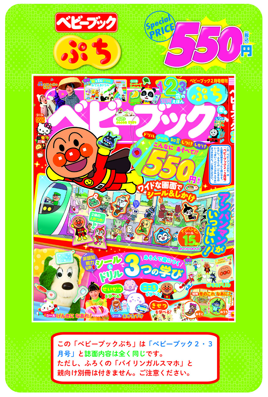子ども向けの本誌のみで550円(税込)なのが「ベビーブックぷち」! 「ベビーブック2・3月号」と内容が同じでふろくと別冊はありませんが、そのぶんリーズナブルな価格がとっても魅力的!
