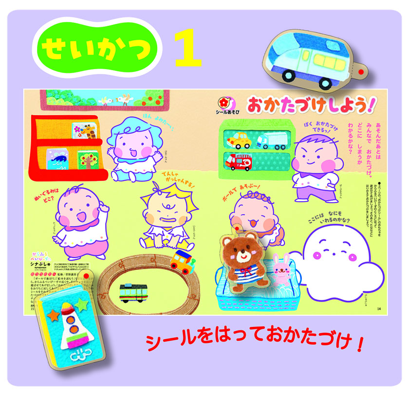 3つ目は電車に乗ってお出かけするシール遊び。パノラマサイズの誌面にシールをはって楽しみましょう!