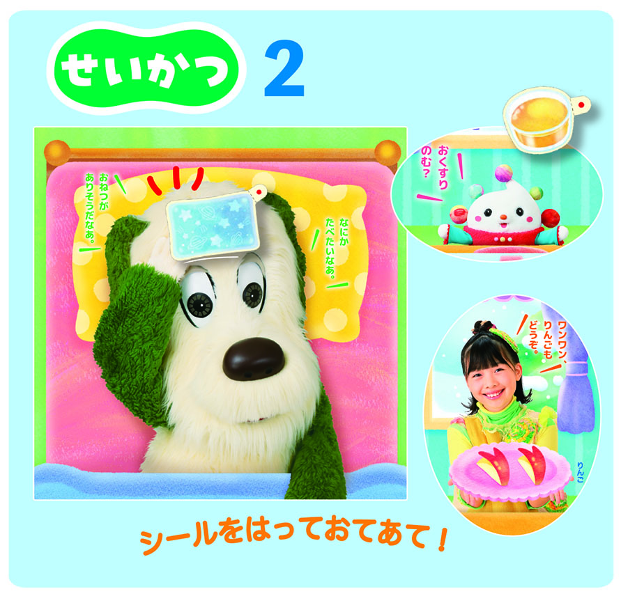 風邪をひいてしまって寝ているワンワンを、おうちゃんとぽぅぽで看病します。くすりやひえひえシートをはって、みんなも優しくお手当してあげてね。