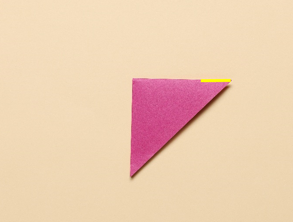 ① 最初に折り紙の裏面(白い方)を上にします。三角形になるように点線のところで折って、折り目をつけます。