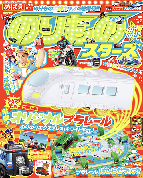 今号のスペシャルふろくは、『のりものスターズ』でしか手に入らない電動オリジナルプラレール のりのりエクスプレス(ホワイトVer.)! 本物のプラレール動力車です。