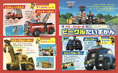 パウ・パトロールたちがトラブルを解決するときに乗っている乗り物・ビークルを大紹介しています。ビークルのパーツや、どんな働きをするかまで詳しくチェックできちゃう!