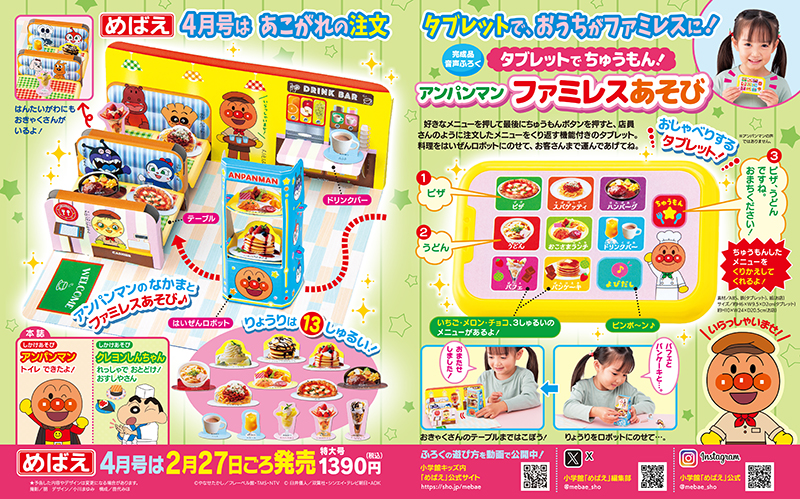『めばえ』3月号のふろくは、「パウ・パトロール パウフェクト キッチンカー」! 扉を持ち上げるとお店がオープンするよ。じょうぶな人形3体つき。お店やさんごっこをして遊んじゃおう♪