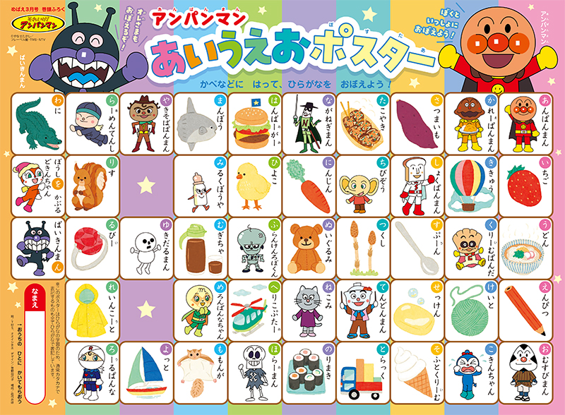 あいうえおから始まる、ものの名前やアンパンマンの仲間たちがいっぱいのポスターだよ。壁などにはって、ひらがなを覚えよう!