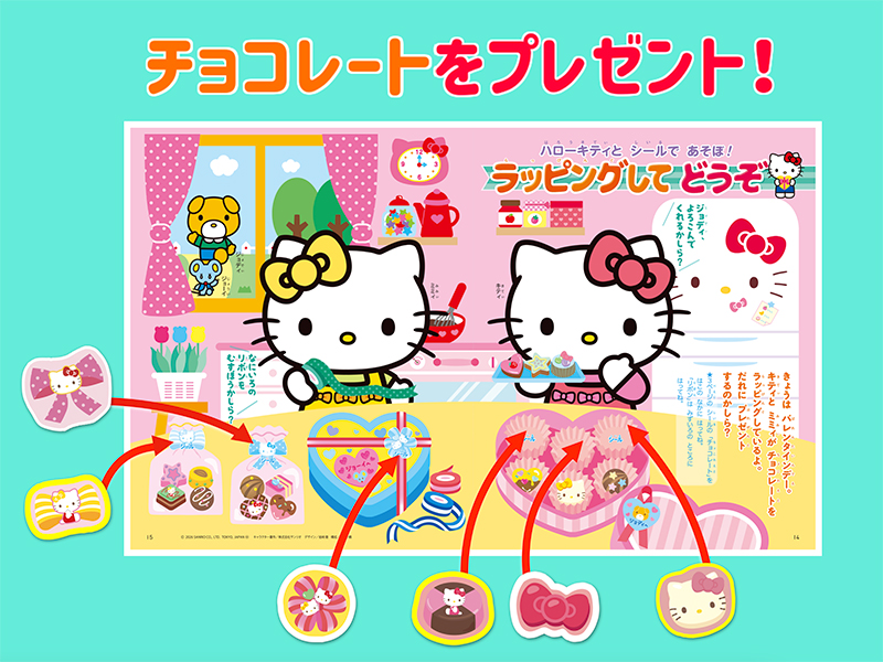 キティとミミィたちがバレンタインデーのチョコレートをラッピングしているよ。チョコレートやリボンのシールをはって、すてきなプレゼントにしちゃおう♪