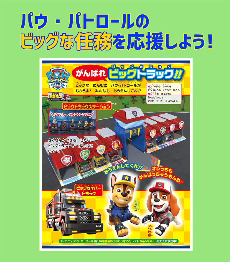 トラブルが発生! パウ・パトロールがビッグトラックでビッグな任務に向かうよ! お話を読みながら「がんばれ!!」と声に出して、パウ・パトロールを応援しよう。