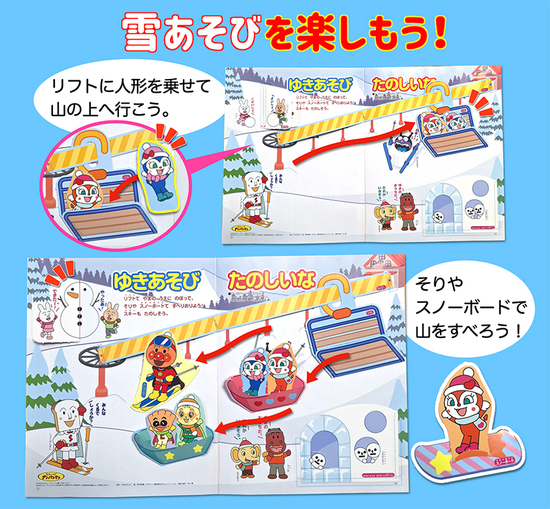 アンパンマンたちが山で楽しい雪あそび! リフトで山の上に行ったら、そりやスノーボードですべり降りよう。雪だるまや雪のおうちでもあそべるよ。