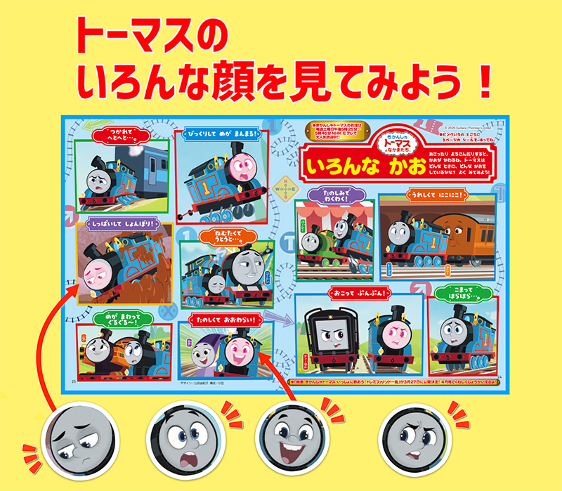 ぷんぷん怒ったり、にこにこ喜んだりすると、顔が変わるね。トーマスはどんなときに、どんな顔をしているのかな? シールをはりながらよく見てみよう!