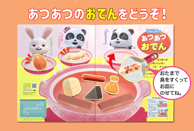 寒い日は、あつあつのおでんがおいしいね! 大根、こんにゃく、卵などの具を、土鍋からおたまですくって、みんなのお皿に取り分けてあそぼう!