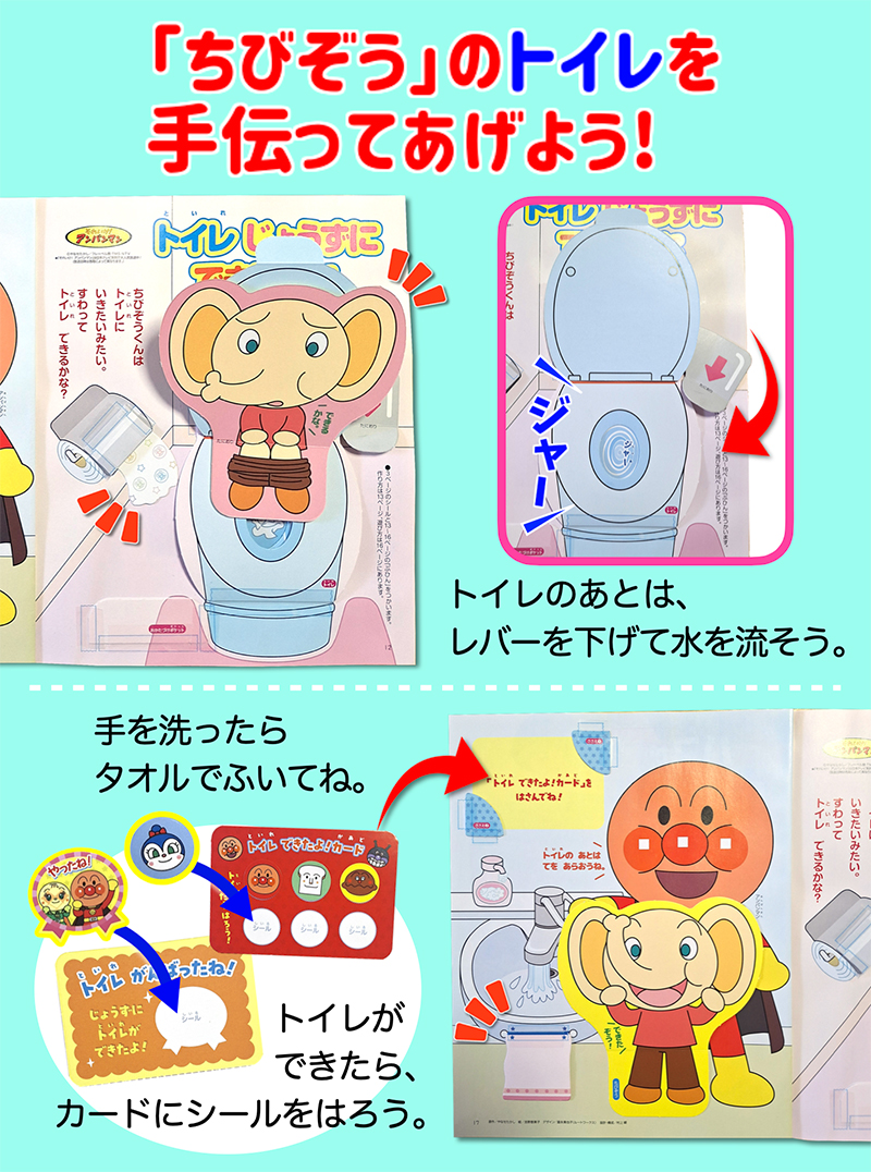 ちびぞうくんをトイレに座らせて、トイレットペーパーで拭いてあげよう。トイレのあとは水を流して、手を洗おうね。みんなもトイレをがんばったらシールがはれる、「できたよ!カード」もついているよ。