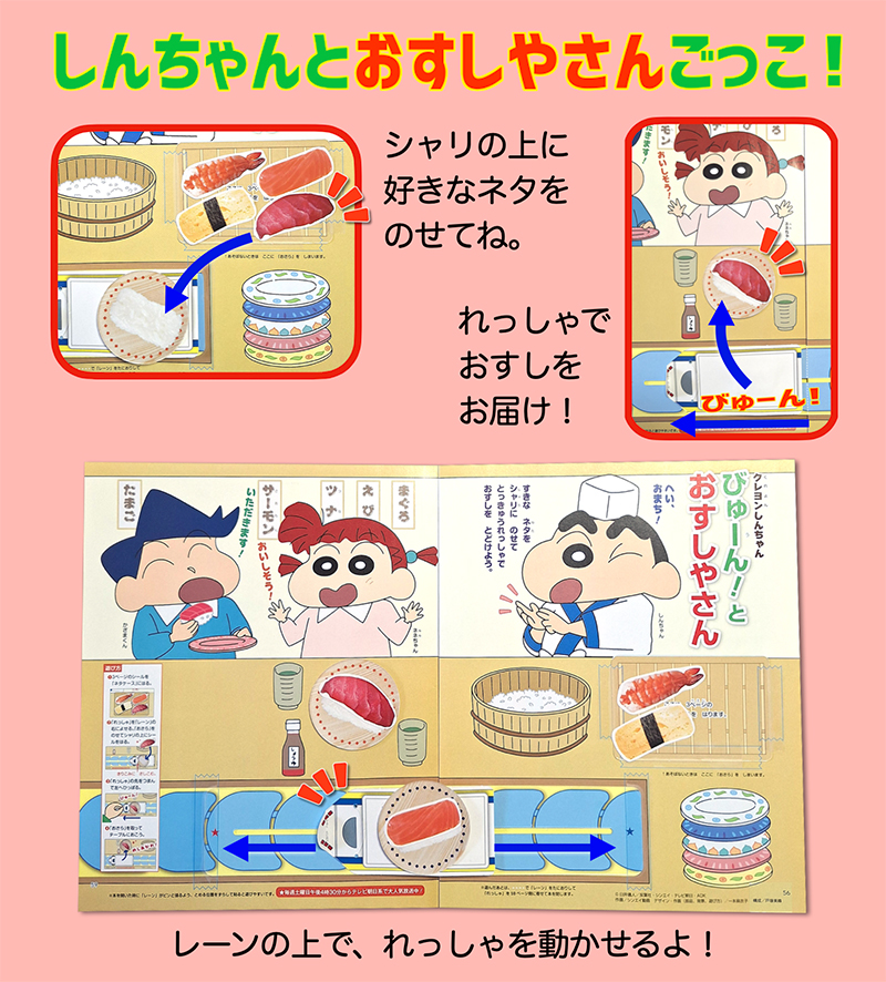 しんちゃんのおすしやさんだよ。シャリの上に好きなネタをのせて、おすしを作ろう。できあがったおすしは、レーンの上のれっしゃでびゅーん!と届けてね。