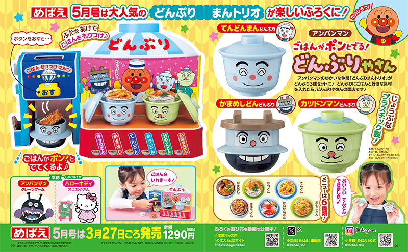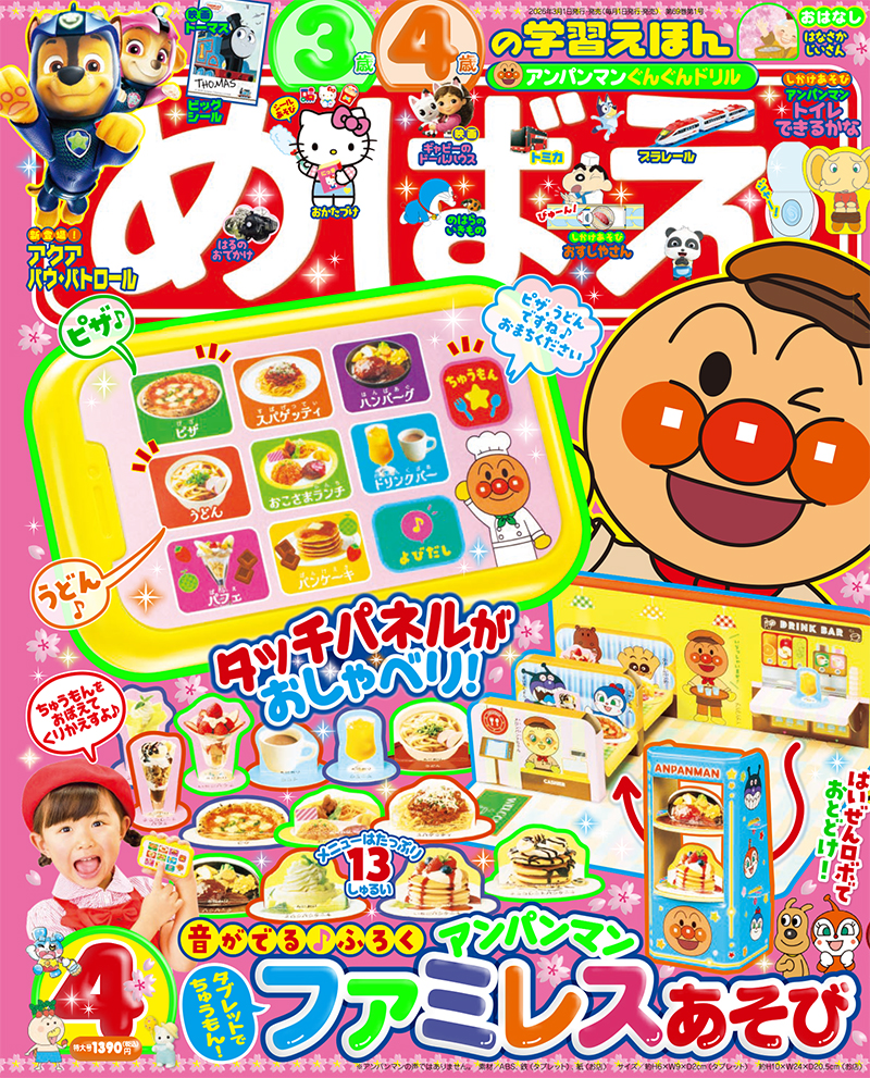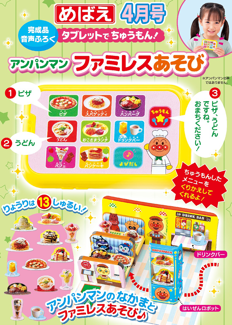『めばえ』4月号のふろくは、「タブレットで ちゅうもん! アンパンマン ファミレスあそび」! 注文したメニューをくり返す、おしゃべり機能付きのタブレット。料理をはいぜんロボットにのせて、ファミレスごっこをしてあそぼう♪