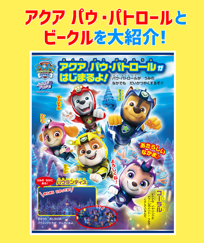 海の中でも大活躍するアクア パウ・パトロールが新登場! 新しい仲間・コーラルのひみつや、アクア パウ・パトロールたちのビークルを紹介するよ。