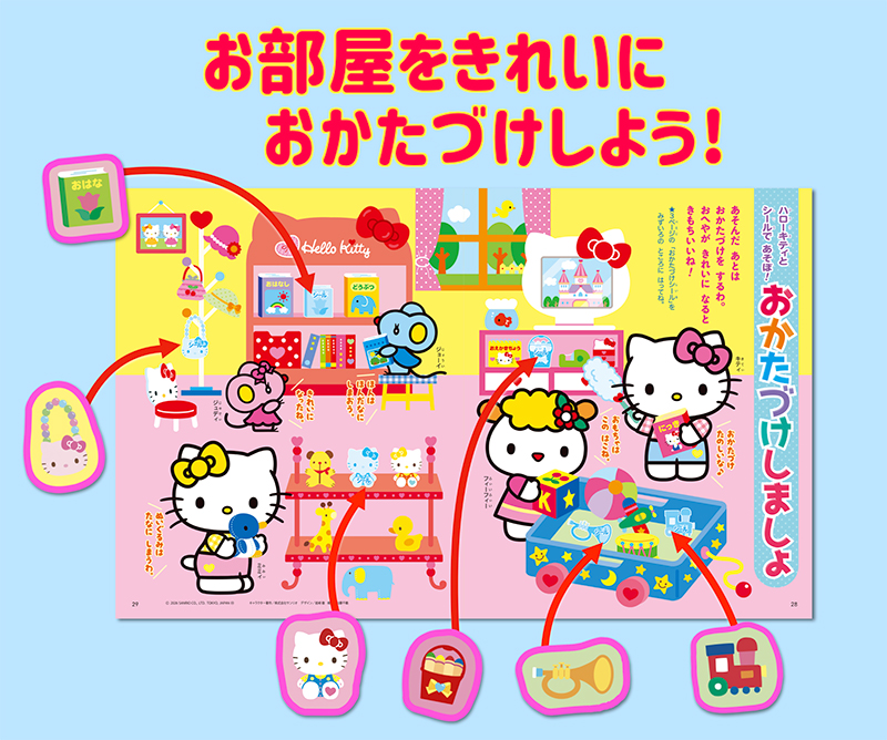 キティとミミィたちがお部屋をおかたづけ。おもちゃや本などのシールを元の場所にはって、きれいにかたづけよう!