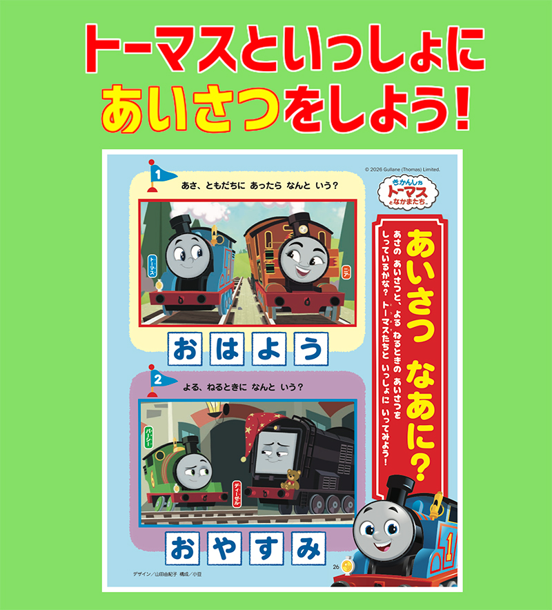 朝のあいさつと、夜寝るときのあいさつを知っているかな? トーマスたちといっしょにあいさつをしてみよう! あいさつの言葉を作りながら進む迷路あそびもあるよ。