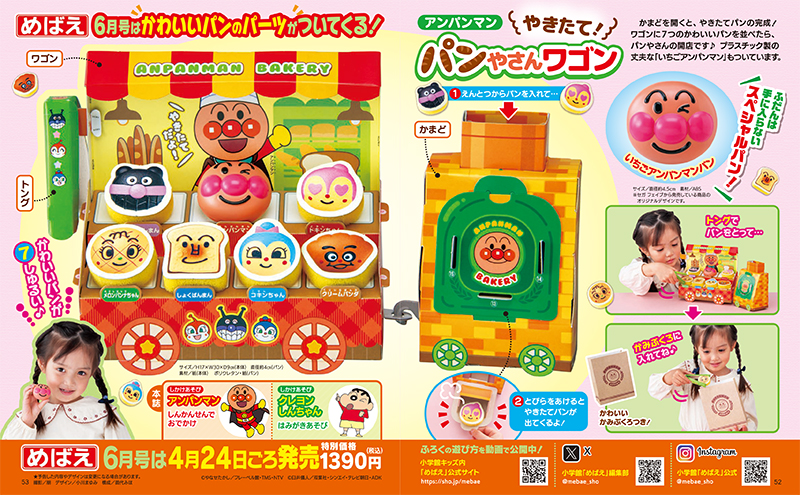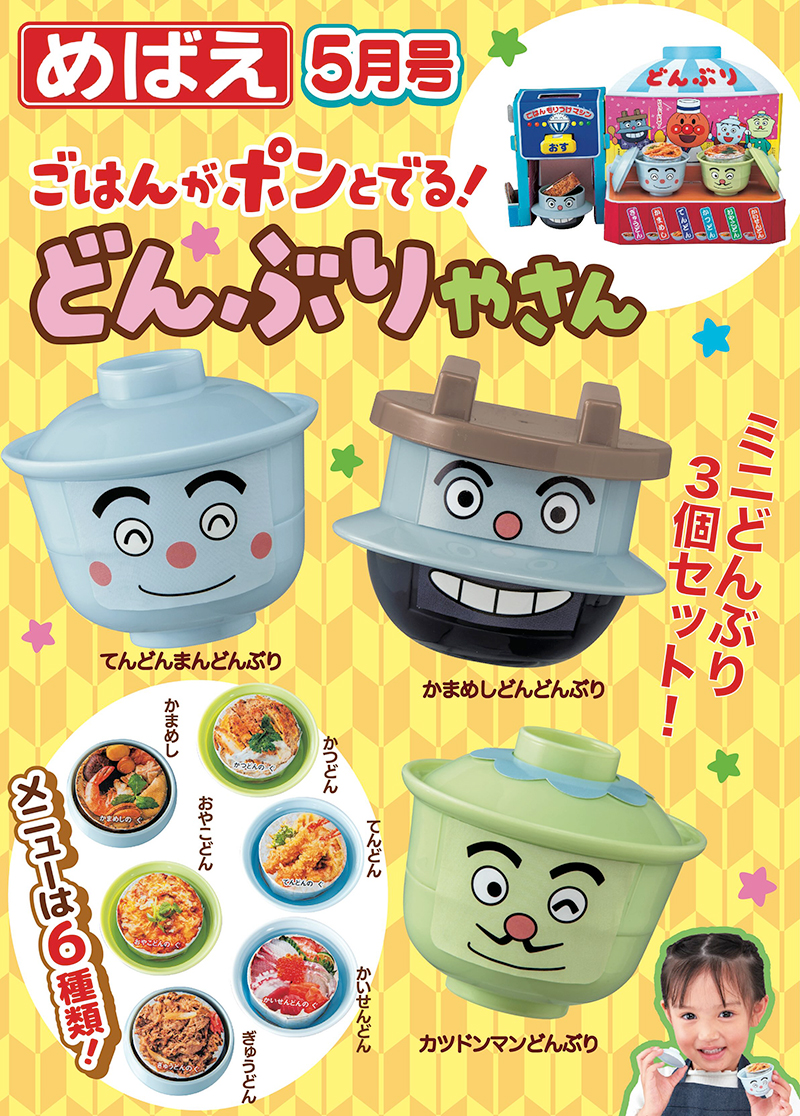 『めばえ』5月号のふろくは、「アンパンマン ごはんがポンとでる! どんぶりやさん 」! ゆかいな仲間「どんぶりまんトリオ」がプラスチック製のどんぶりになったよ。ボタンを押すと、どんぶりにごはんが盛りつけられるマシーンつき。好きな具材を入れて、どんぶりやさんごっこをしよう!