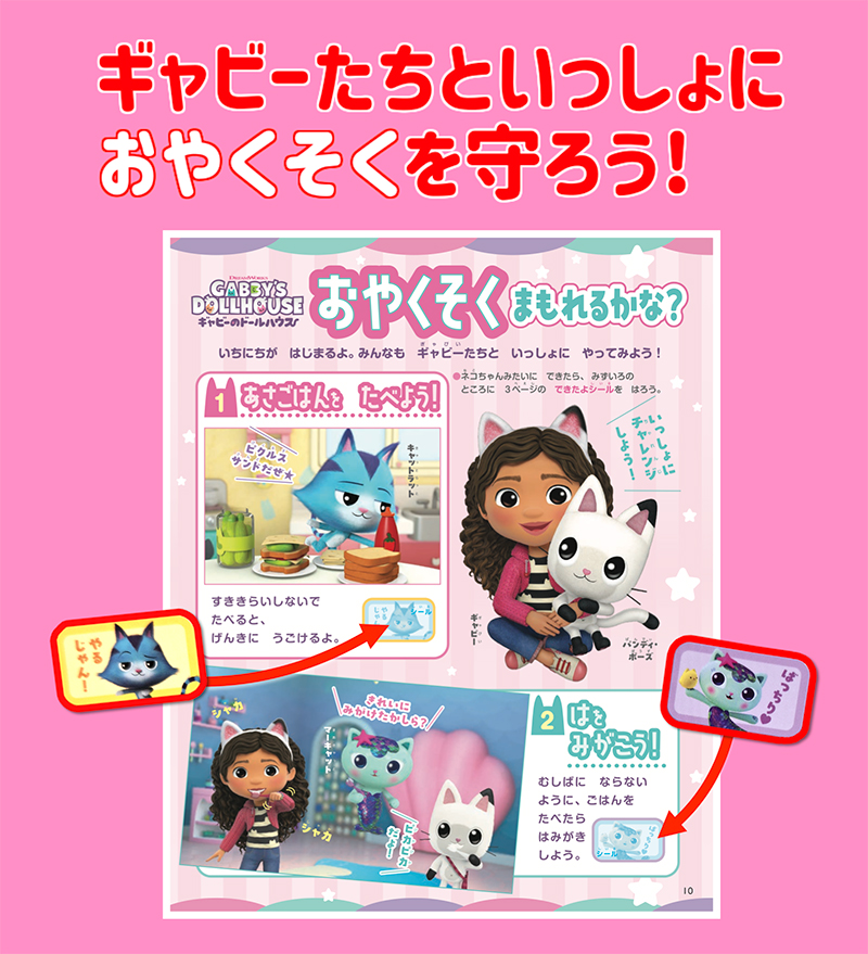 歯みがきやお風呂などの、毎日守りたいおやくそく。ギャビーたちといっしょに、シールをはりながらやってみよう!
