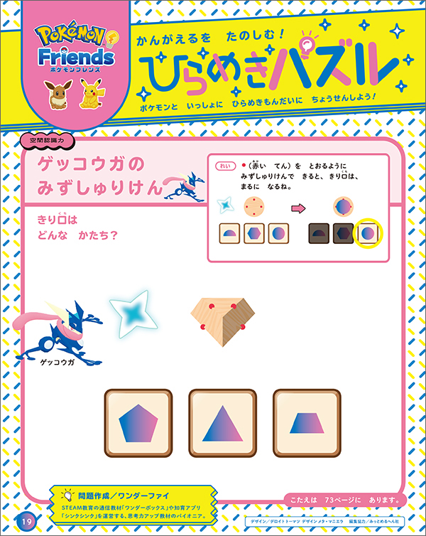 新作ゲーム『ポケモンフレンズ』が誌面で遊べるよ。ポケモンといっしょに、ひらめき問題に挑戦しよう! 空間認識力や試行錯誤力、図形認識力、論理的思考力を育てる4問を出題。楽しく取り組んで頭をほぐそう!