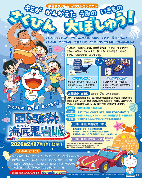 2026年2月27日(金)に公開される、「映画ドラえもん 新・のび太の海底奇岩城」は、海の底を大冒険するストーリー! 映画の公開を記念して、イラストコンテストを開催するよ。キミの作品を待っているよ!