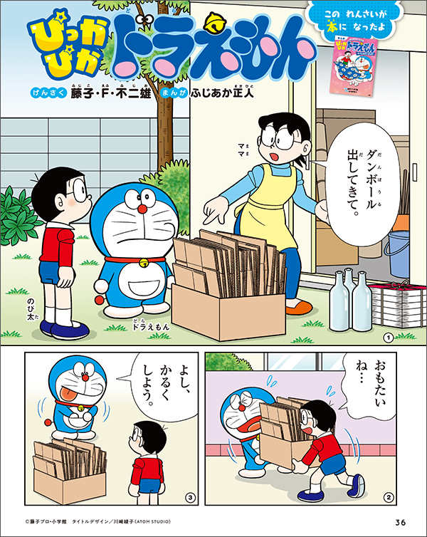 ママにお手伝いを頼まれたのび太くんとドラえもん。重い段ボールを運ばなくてはなりません。そこでドラえもんがひみつ道具「ふんわりガス」を出してくれました。