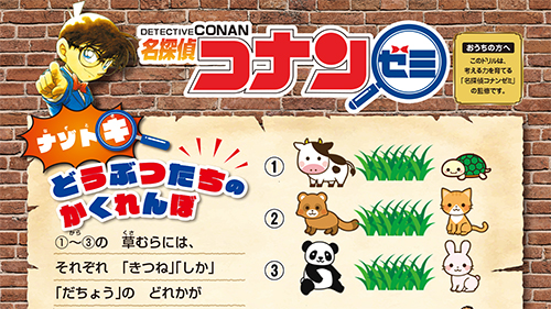 考える力を育てる「名探偵コナンゼミ」の監修によるナゾトキを出題。言葉の並び方からひらめく力を鍛える「どうぶつたちのかくれんぼ」ナゾトキに挑戦してみましょう!