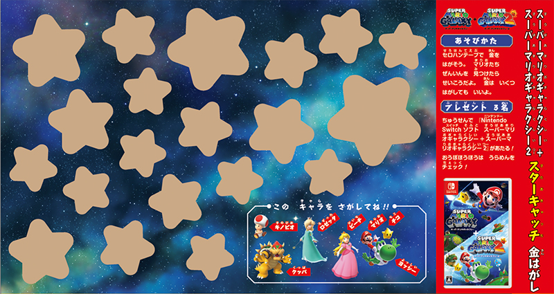 セロハンテープで金をはがして、マリオたち全員を見つけたら成功! 抽選で『Nintendo Switch ソフト スーパーマリオギャラクシー+スーパーマリオギャラクシー2』が当たるプレゼントに応募できます。